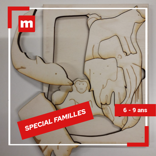 Créez votre jeu en famille ! Curieux de découvrir l'intelligence animale tout en bricolant ? Venez fabriquer ensemble un casse-tête en bois représentant des animaux surprenants et son sac de rangement assorti ! Un moment de partage pour explorer la fabrication numérique et le monde du vivant. En binôme, vous utiliserez la découpeuse laser pour réaliser les pièces de votre puzzle. Dans un second temps, vous vous initierez à la couture pour assembler un sac en tissu personnalisé, idéal pour transporter votre création.